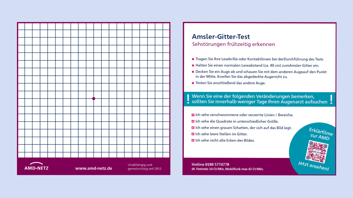 Wir bieten Ihnen verschiedene Materialen zur Weitergabe an Ihre AMD-Patienten. Bestellen Sie diese gerne über unser Kontaktformular. Wir gewähren Ihnen 50% Rabatt, wenn Sie Versorgungspartner werden. Damit unterstützen Sie unsere Arbeit. Unser Patientenhandout zur altersabhängigen Makuladegeneration mit individualisierten Informationen zum jeweiligen Stand der Erkrankung können Sie mit wenigen Klicks hier erstellen.