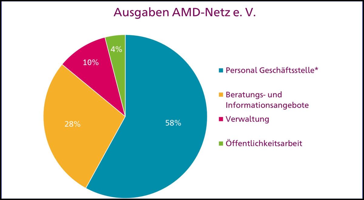 Die Ausgaben des AMD-Netz e. V. unterteilen sich in vier Bereiche: 58% der Ausgaben entfallen auf das Personal der Geschäftsstelle. Als Netzwerk stehen wir im persönlichen Kontakt mit Betroffenen und Angehörigen, sowie mit allen Fachgruppen, die an der Versorgung bei AMD beteiligt sind. Zudem führen wir eigenständig und in Kooperation meist langjährige Forschungsprojekte durch.